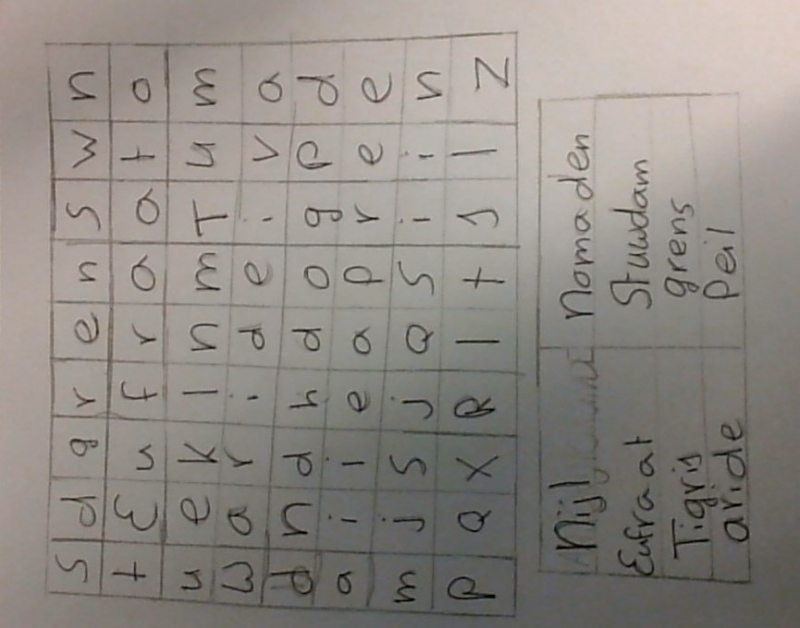 Veel plezier met de kruiswoordpuzzel. Je moet de woorden: Nijl, Eufraat, Tigris, Aride, Nomaden, Stuwdam, Grens en Peil zoeken.